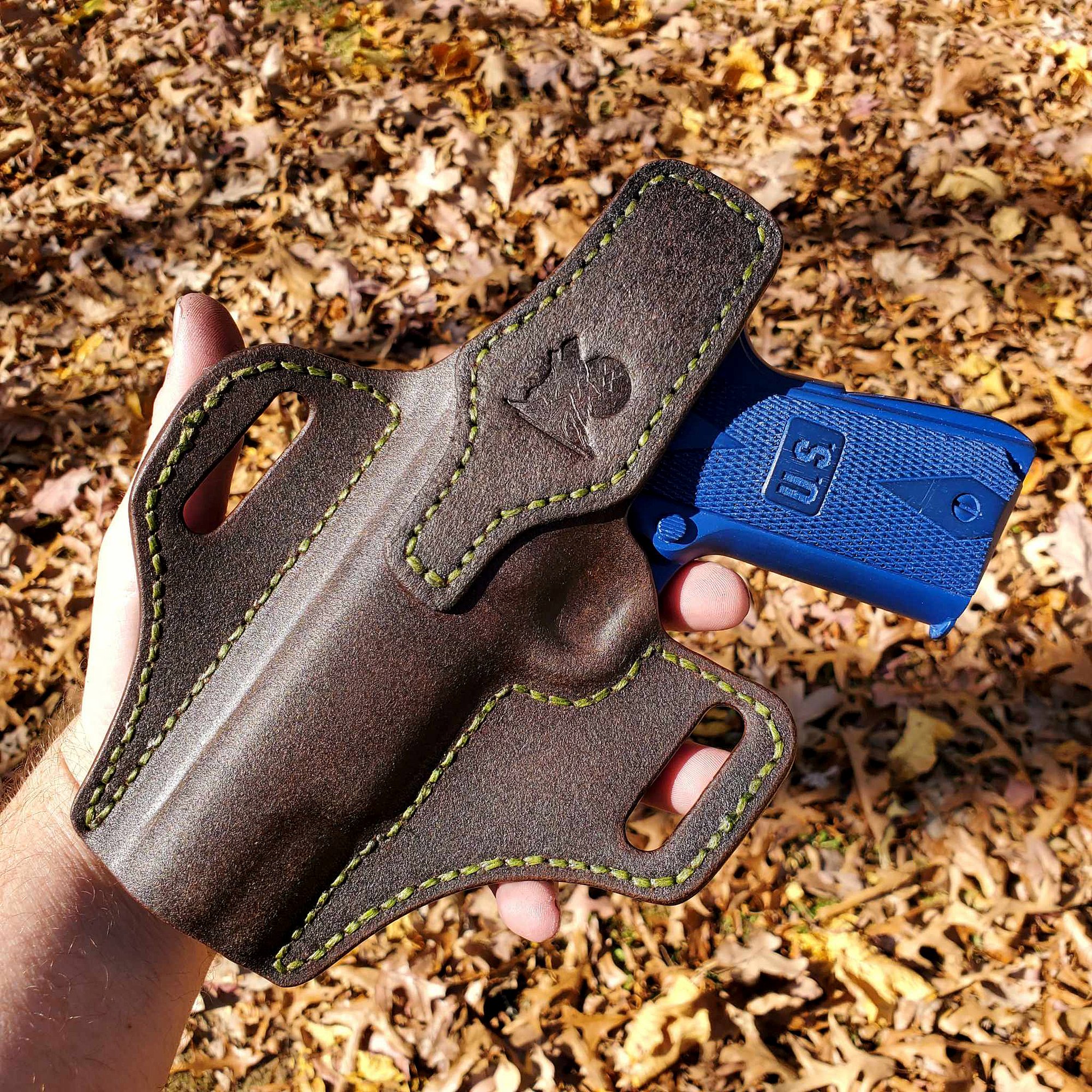 All of my holsters are hand made one at a time by me in my NC studio. I used Herman Oak leather and Olive Drab Maine thread for this build, The back of the holster is ruff side out Dark Brown. The front is RAT dyed camo.
